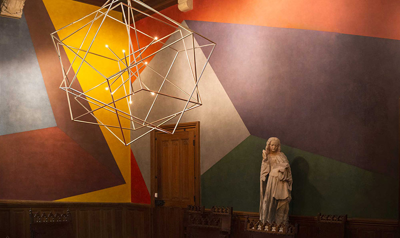 Le Wall Drawing du Donjon de Vez se distingue par sa rigueur et son caractère immersif. Les murs deviennent une surface vivante où se déploient des combinaisons géométriques soigneusement orchestrées. LeWitt ne cherche pas seulement à produire une œuvre d’art, mais à interroger la relation entre l’espace et le spectateur. La salle elle-même devient une part intégrante de l’œuvre, un environnement où l’art et l’architecture dialoguent.